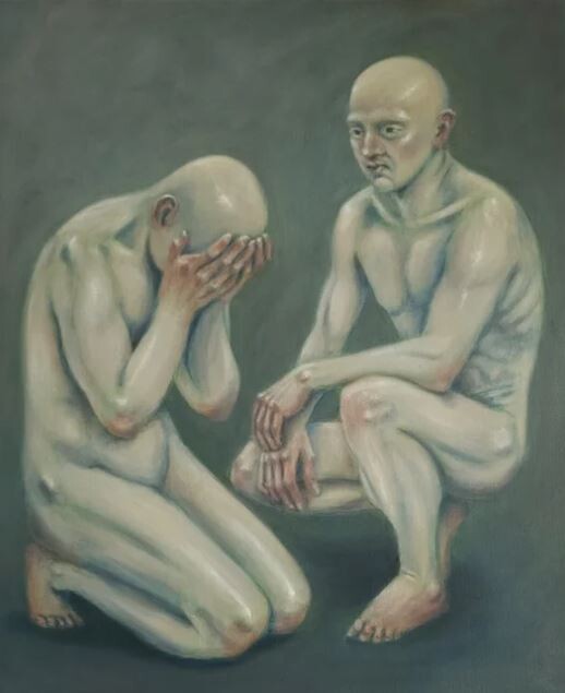 Nackt im Sein portrays two figures in close proximity without physical intervention. The work addresses vulnerability—both physical and emotional—by redefining care not as action, but as presence. Here, nudity is presented not as provocation, but as truth: a moment in which social roles and protective layers fall away, revealing an unguarded human condition.