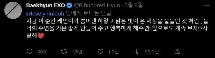 After the party, Baekhyun found a post on social media written by the child's mother and left a message full of affection, saying, "As if the white and clear light emitted at this moment colored the whole world, always make the people around you feel good and happy. Let's see. I love you."
