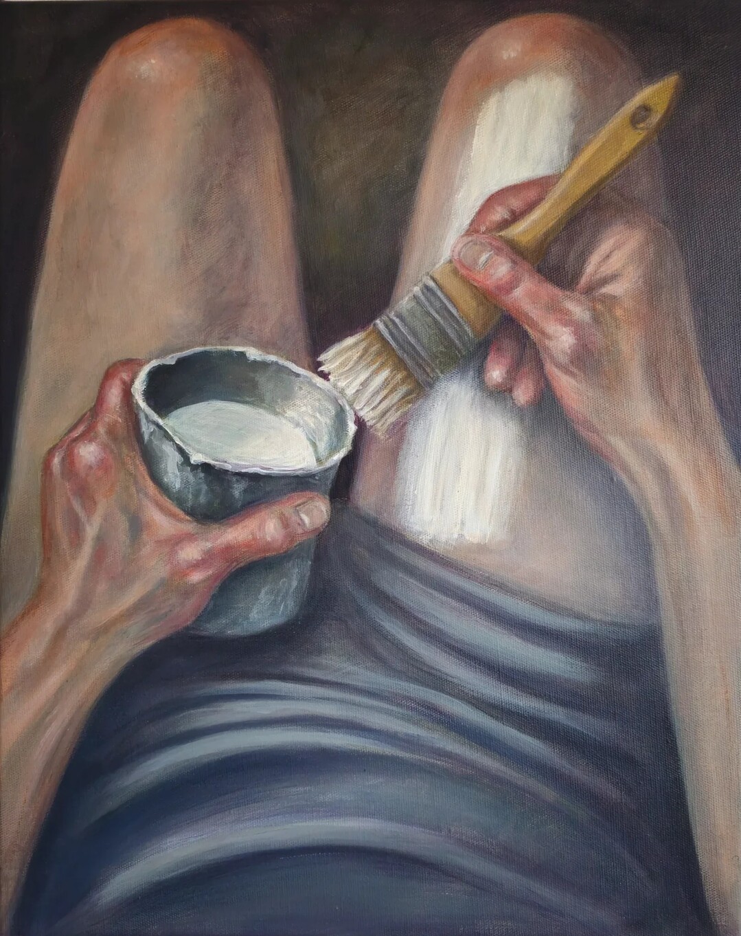 In Sightless Vision, the viewer is placed in an ego perspective. One hand tightly grips a cup, symbolizing control, while the other loosely holds a brush. The tension between holding on and letting go unfolds in a moment of decision, as white paint touches skin for the first time. The color white oscillates between concealment and revelation, standing for acceptance, forgiveness and the acknowledgment of imperfection.