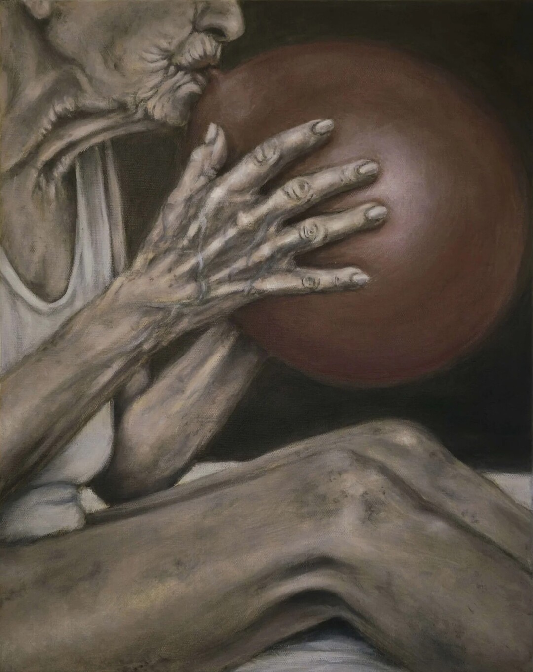 Latenz deliberately unsettles visual balance. Cropped features, uneven posture and contrasting bodily textures provoke an impulse to correct or optimize the image. Zucker uses this discomfort to reflect on humanity’s habitual drive toward perfection—and how that impulse may soften with age. The inflated balloon and aging body share the same air, suggesting that while the body weakens, the inner self continues to mature.