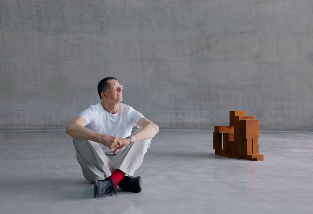 Antony Gormley with his "Blockwork" sculpture at Ground, a new permanent space at Museum SAN, created with architect Tadao Ando. [MUSEUM SAN]