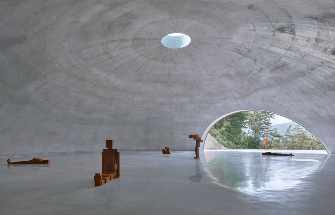 Antony Gormley's seven "Blockworks" are installed in the concrete dome designed by Tadao Ando dubbed Ground. [MUSEUM SAN]