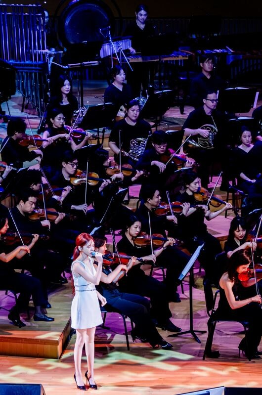 In February, the Seoul Philharmonic Orchestra performed orchestral arrangements of songs by SM Entertainment artists, arranged by SM Classics. In this image, girl group Red Velvet’s Wendy sings as a featured soloist. Courtesy of SM ENTERTAINMENT